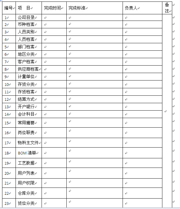 2.1、成立数据小组,确定工作进度,确定数据担当者艰苦细致的工作要有踏实能干的团队担当,严密的计划和合理的组织是完成这项艰巨工作的保证。数据小组成员从各个部门的业务人员中抽调,由项目经理或指定的专人负责数据小组的全面领导工作。数据小组的职责是分析数据准备的范围,建立ERP编码体系,组织必要的培训,制作数据搜集表格模板,监督数据收集质量,并负责数据的最终导入和使用。在工作执行上,数据小组要根据ERP项目的实施进度,制定基础数据整理的时间表,安排好小组成员的分工,并定期召开小组会议,沟通问题,推进工作。 基础数据整理责任表