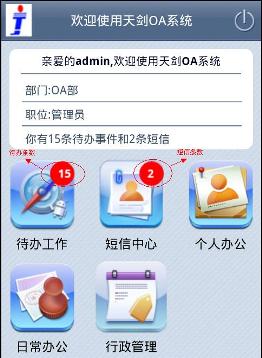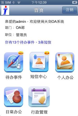 -天剑OA移动应用客户端的功能包括:待办事宜、短信、文件共享、请假单、出差单、加班单、工作计划、工作总结、工作汇报、请示报告、通知管理等功能。