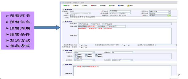 车间生产执行过程中,往往会出现一些异常情况,如何对可能出现的异常情况提前预警,从而今早采取措施,成为车间现场管理的首要任务,能将企业管理者从救火队解放出来,将大多数异常变为常态问题加以流程化,规范化处理,我们的MES提供了可配置的预警平台,通过此平台能定义预警信息的内容,产生条件,发送方式,发送对象,发送频率。