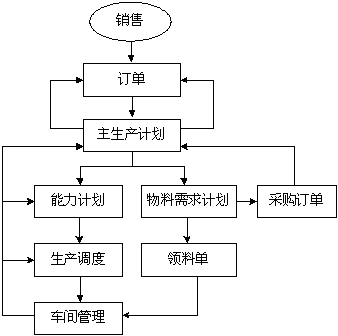 电子元器件行业ERP系统中,MRPⅡ中计划管理的作用不明显,生产部门的主要事务不在MPS、MRP上,适应市场变化的能力体现在作业计划与生产调度上。主要流程特点见下图: