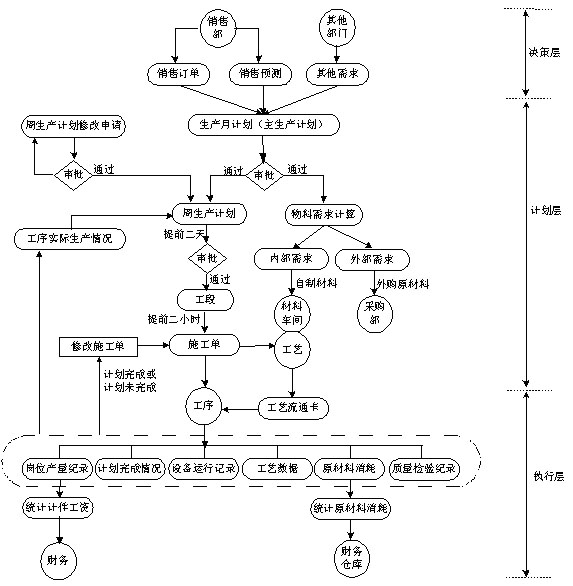 企业的实际情况确定了企业生产管理模式的特殊性,系统必须与现有的生产管理模式相符,才能保证系统实施成功。生产流程: